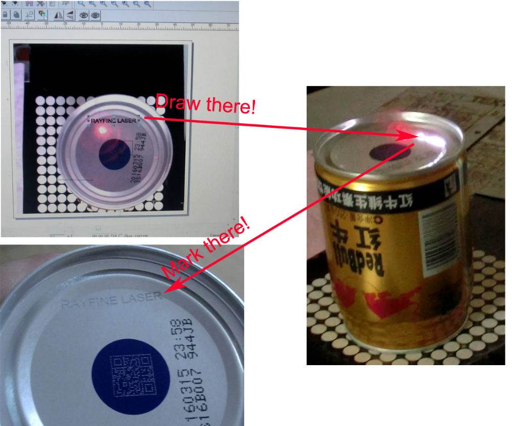 It can easily get the mark position on the computer: draw there, mark there. We can see work-piece photo in software through the camera.Then we can set the marking point on the photo via software, then the machine engrave the same place on the work-piece, no need to move the work-piece.